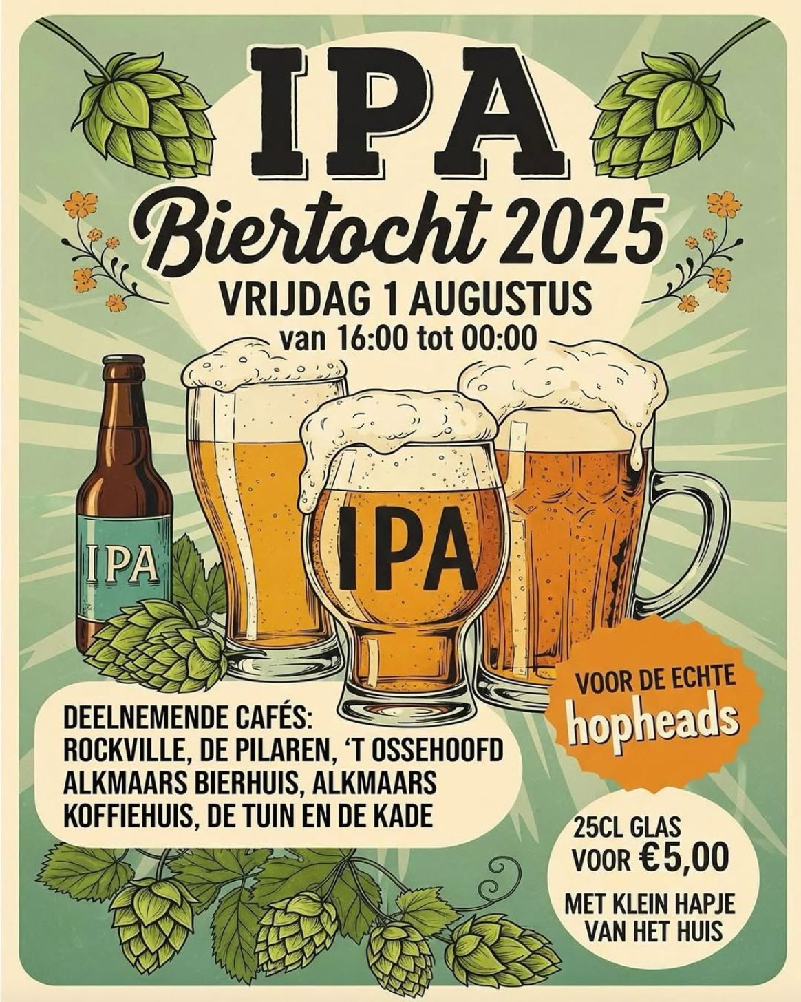 Zin in een stevige slok zomer? Sluit je aan bij de IPA Biertocht 2025 – een hopvol kroegenspektakel dwars door Alkmaar. Van Rockville tot De Pilaren en van ’t Ossehoofd tot De Kade: zeven cafés, één missie… IPA proeven tot je smaakpapillen in polonaise gaan.