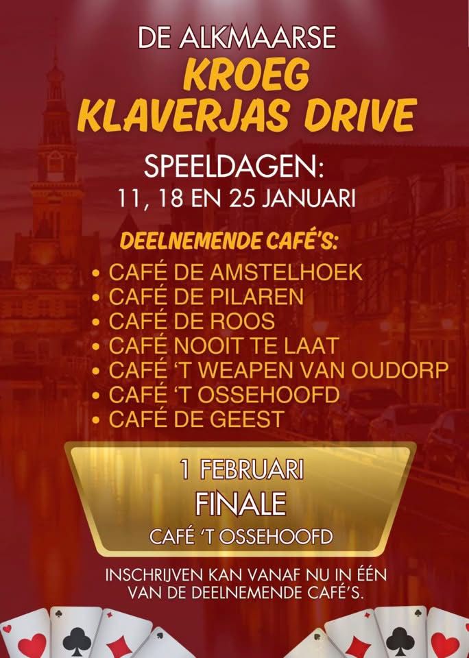 De klaverjasdrive is er weer! In te schrijven bij onderstaande cafés. Speeldata zijn zondag 11, 18 en 25 januari. |